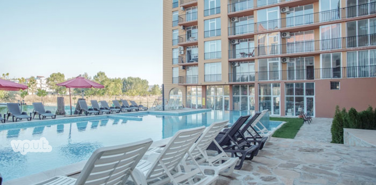 Студия площадью 32 квадратных метра в комплексе «Сани-вью-саут» (Sunny View South), в южном районе Солнечного берега (Болгария). Жильё находится на четвёртом этаже. В распоряжении гостей балкон с видом на бассейн. Бесплатный Wi-Fi доступен в холле и на балконе.